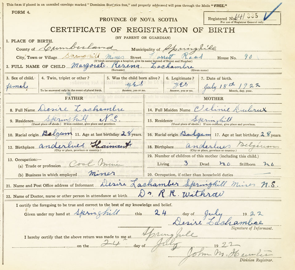21. Name and Post Office address of Informant Desire Lachamber Springhill Mines