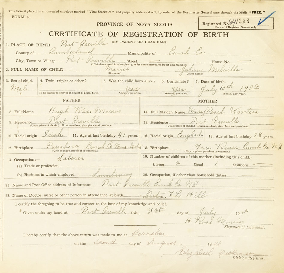 21. Name and Post Office address of Informant H. Ross Morris Port Greville, Cumb.