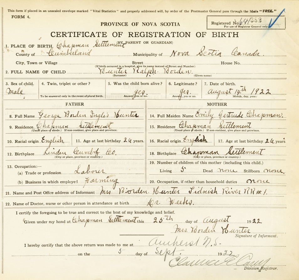 21. Name and Post Office address of Informant Mrs. Borden Hunter Tidnish River RR #1, Cumberland Nova Scotia