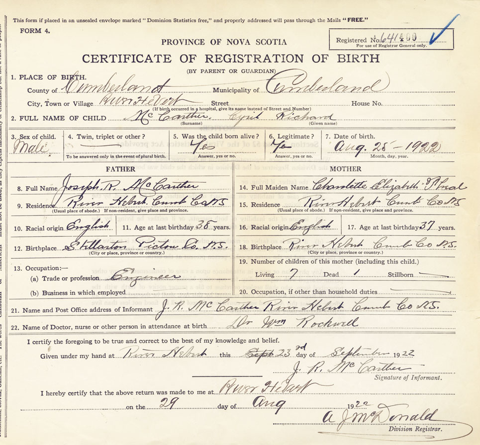 21. Name and Post Office address of Informant J.R. McCarthur River Hebert, Cumberland Co,NS