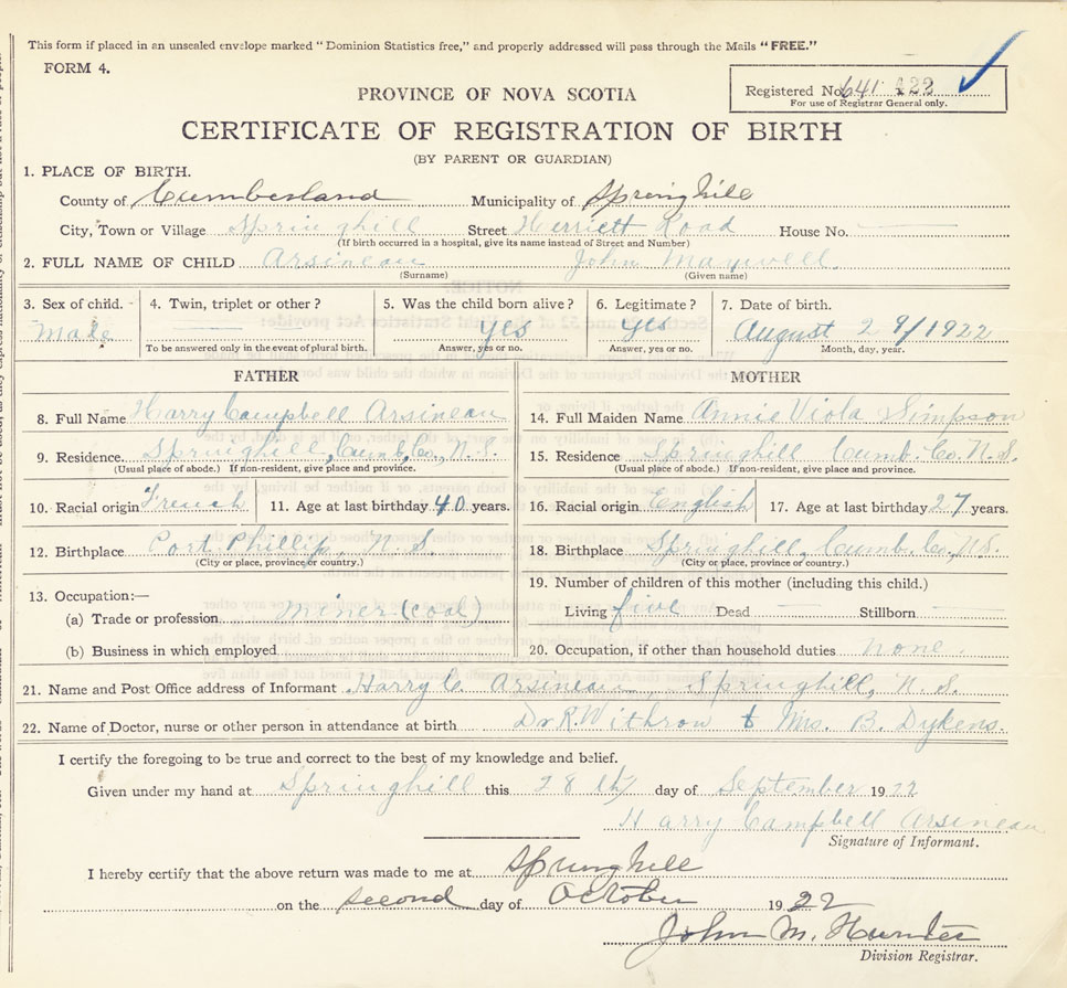 21. Name and Post Office address of Informant Harry Le Arsineau Springhill, N.S