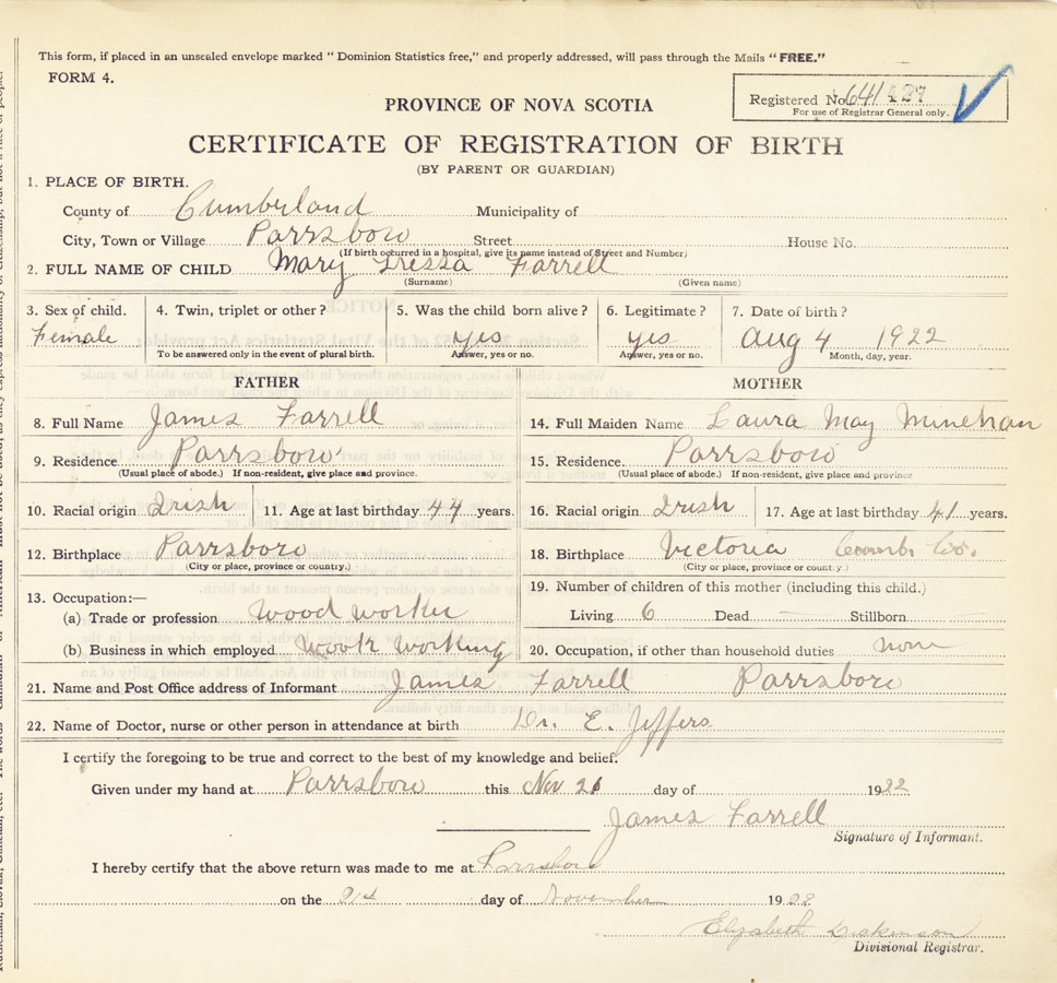21. Name and Post Office address of Informant James Farrell Parrsboro