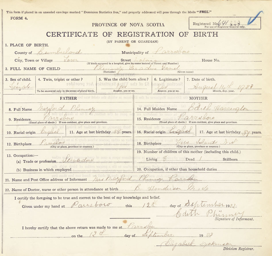 21. Name and Post Office address of Informant Mrs. Mayford Phinney Parrsboro