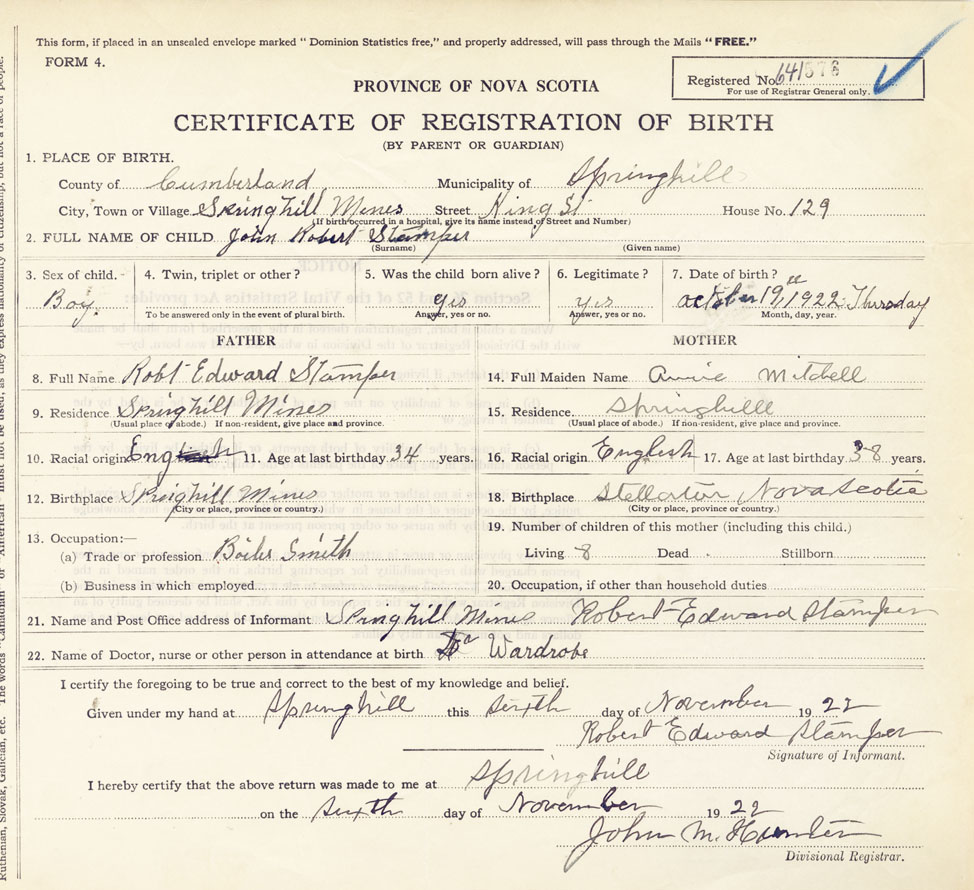 21. Name and Post Office address of Informant Robert Edward Stamper Springhill Mines