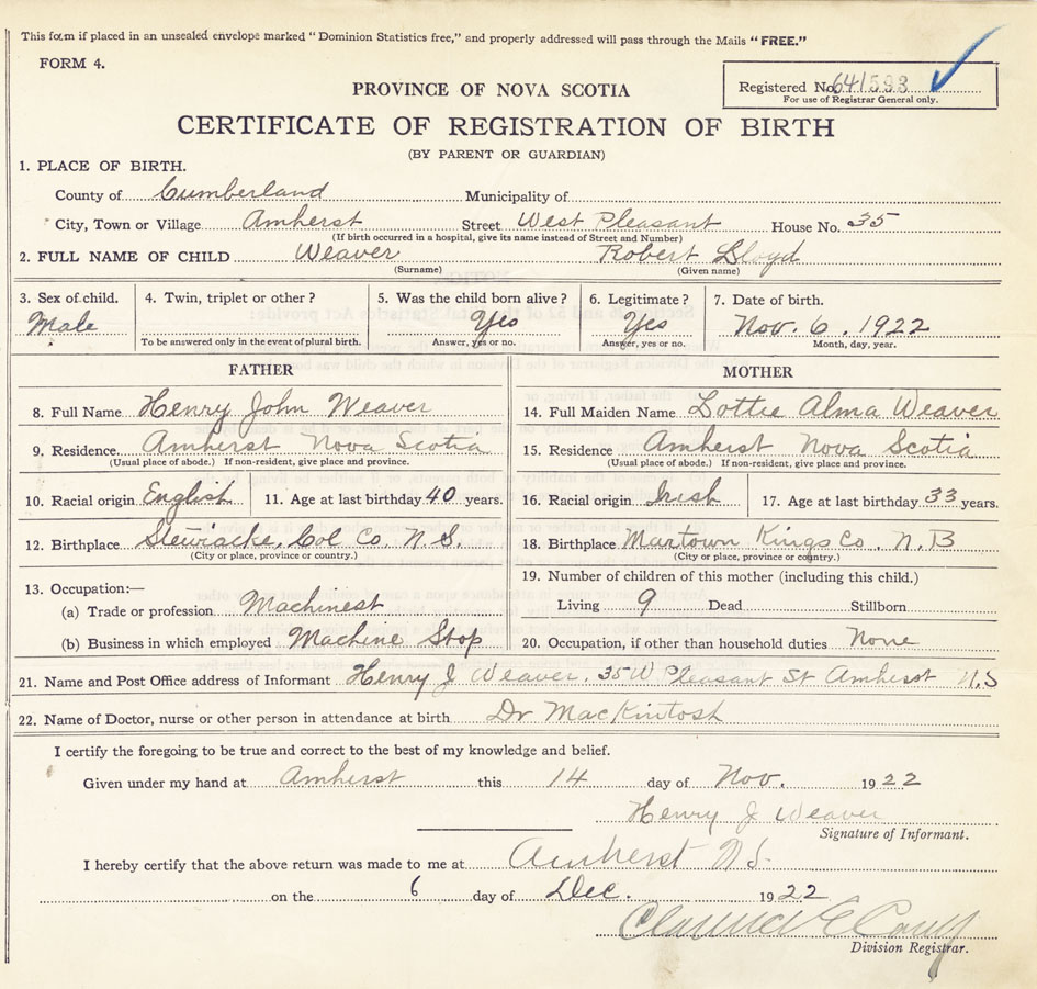 21. Name and Post Office address of Informant Henry J. Weaver 35 W Pleasant St. Amherst N.S.