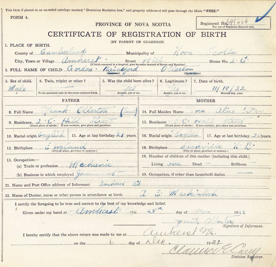 Note: Last name previously transcribed as Alberton, it was corrected during review of birth record and confirmation with Marriage Record and obituary. Gordon signed middle name as Rensford on marriage record and it is spelled Rensford in obituary.