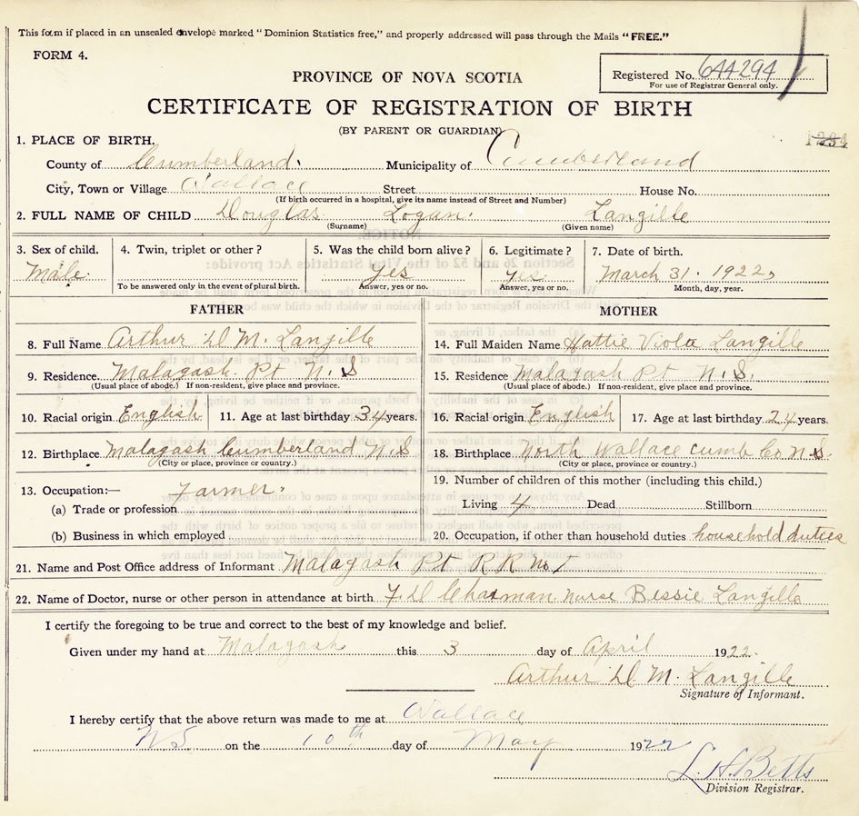 22. Name of Doctor, nurse or other person in attendance at birth F.D. Chapman, Nurse Bessie Langille
