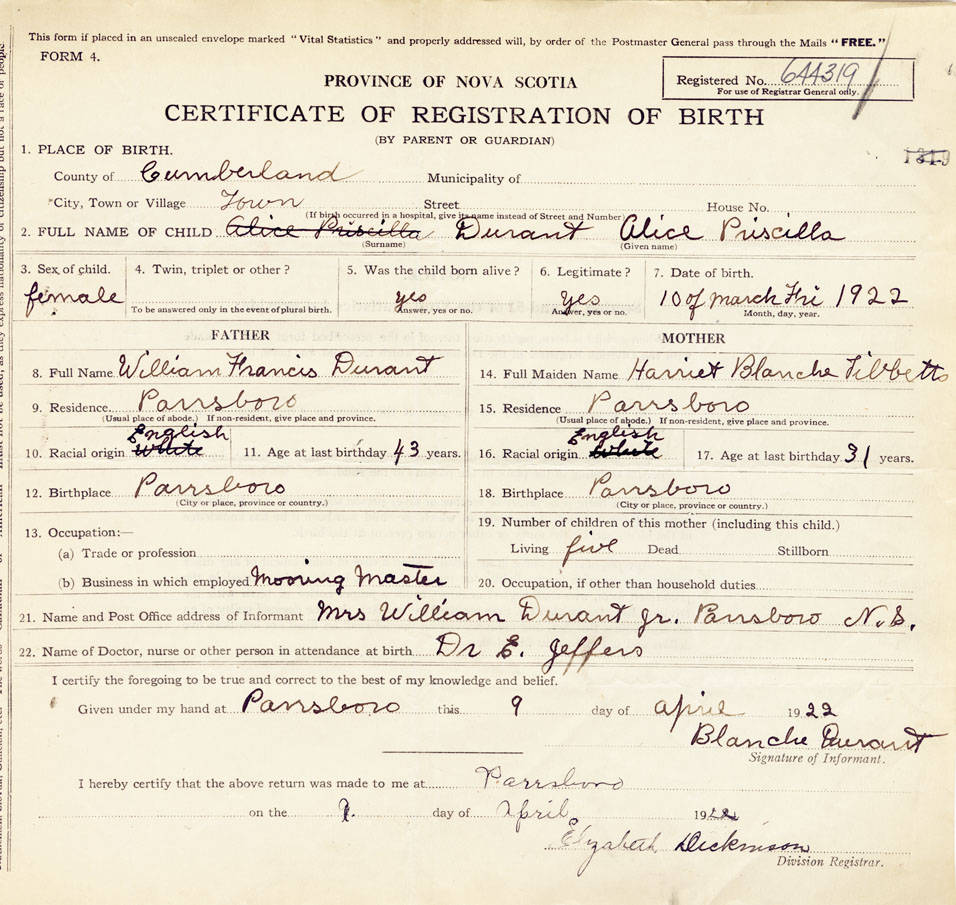 21. Name and Post Office address of Informant Mrs. William Durant Jr. Parrsboro