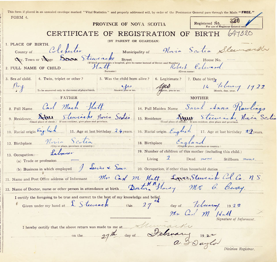 21. Name and Post Office address of Informant Mrs. Carl M. Hatt Stewiacke, Colchester