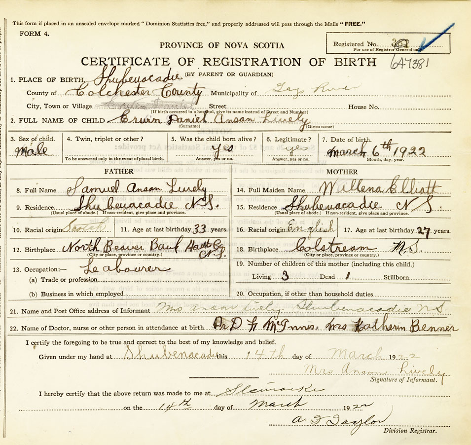 21. Name and Post Office address of Informant Mrs. Ansan Lively Shubenacadie