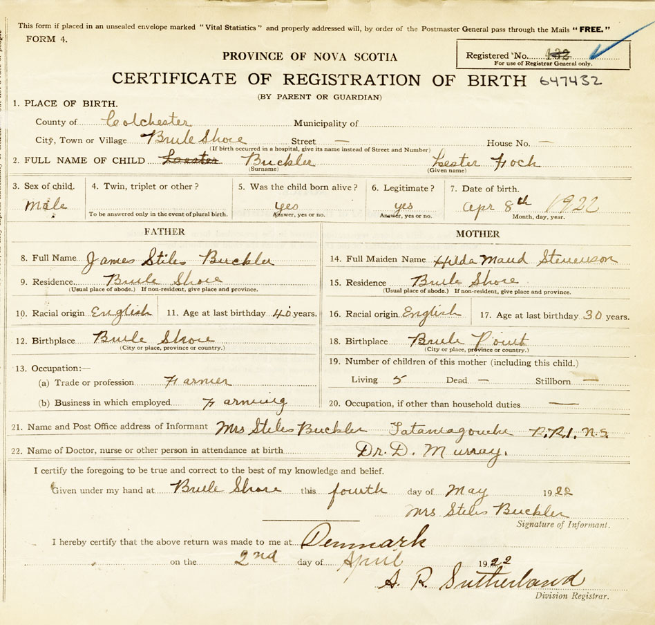 21. Name and Post Office address of Informant Mrs. Stiles Buckler Tatamagouche R. R. 1 N.S.