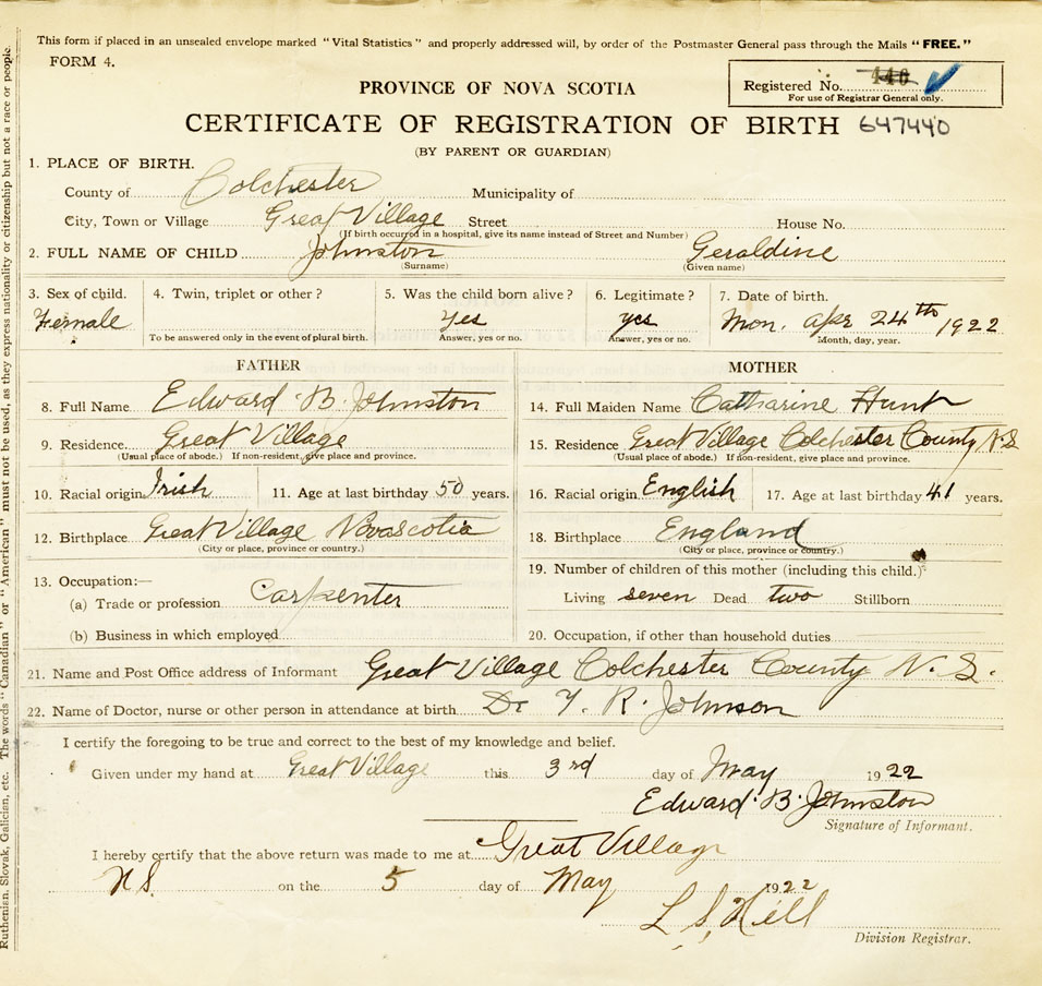 21. Name and Post Office address of Informant Edward B. Johnston Great Village, Colchester County