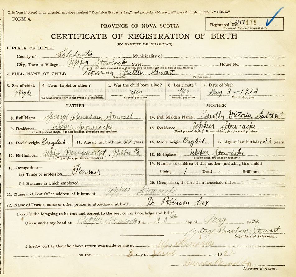 21. Name and Post Office address of Informant George Burnham Stewart Upper Stewiacke