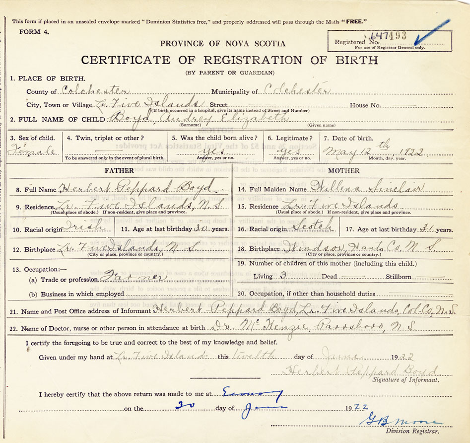 22. Name of Doctor, nurse or other person in attendance at birth Dr. McKenzie, Parrsboro