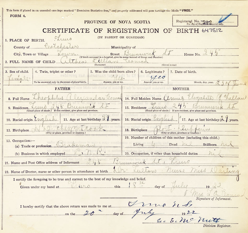 21. Name and Post Office address of Informant Mrs. T. A. Conrad 245 Brunswick St., Truro
