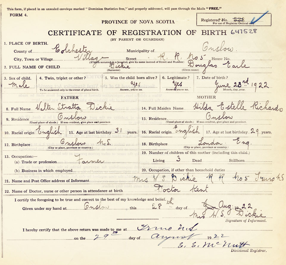 21. Name and Post Office address of Informant Mrs. W.S. Dickie RR No. 5, Truro