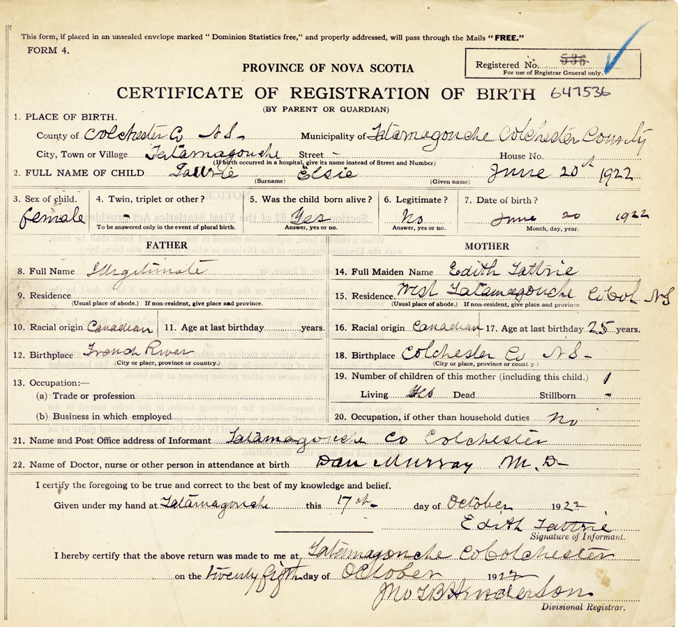 21. Name and Post Office address of Informant Edith Tattrie Tatamagouche, Colchester