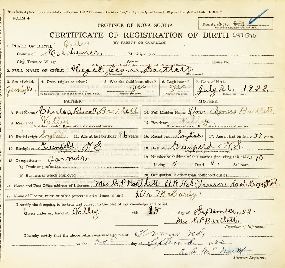 21. Name and Post Office address of Informant Mrs. C. P. Bartlett R. R. #2 Truro, Col.