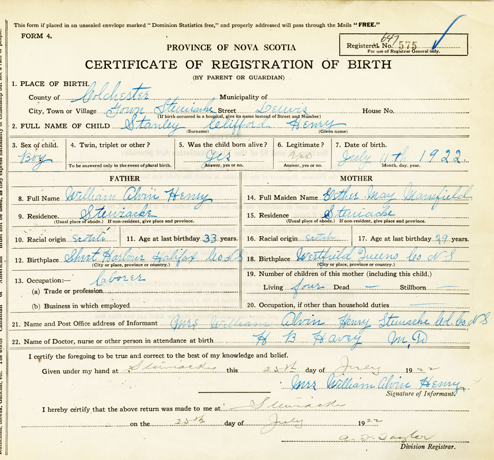 21. Name and Post Office address of Informant Mrs. William Alvin Henry Stewiacke, Colchester