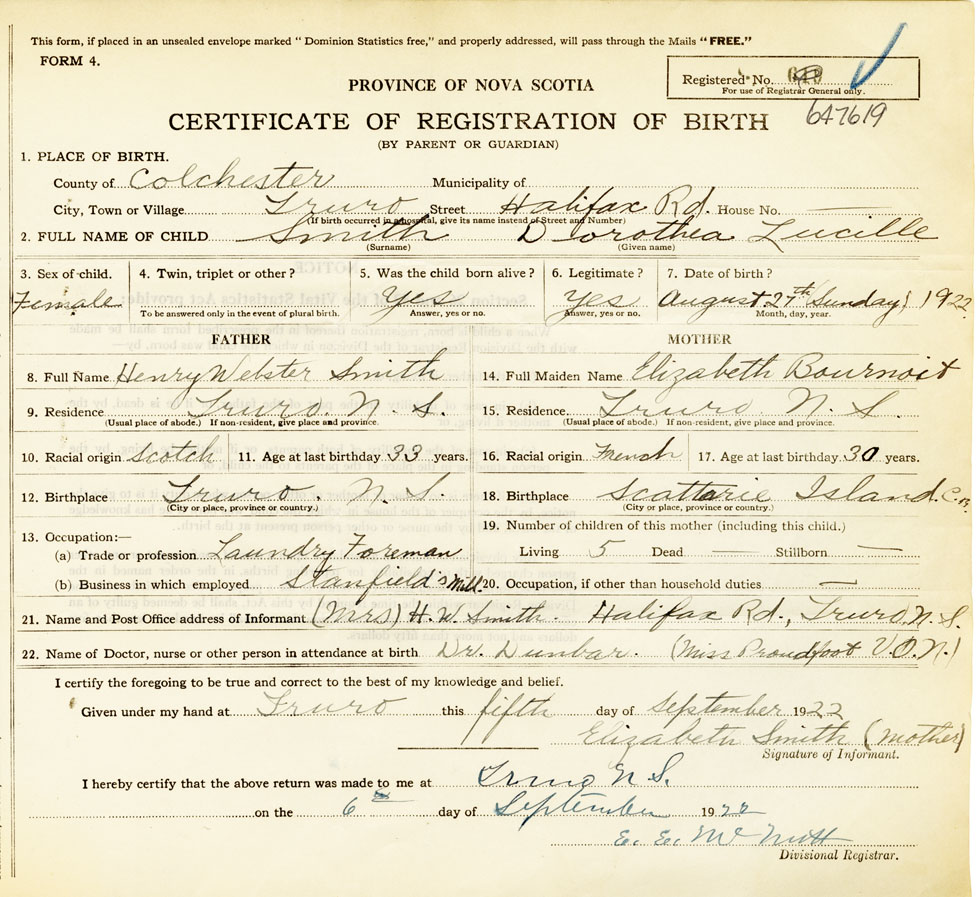 21. Name and Post Office address of Informant Mrs. H. W. Smith Halifax Rd., Truro