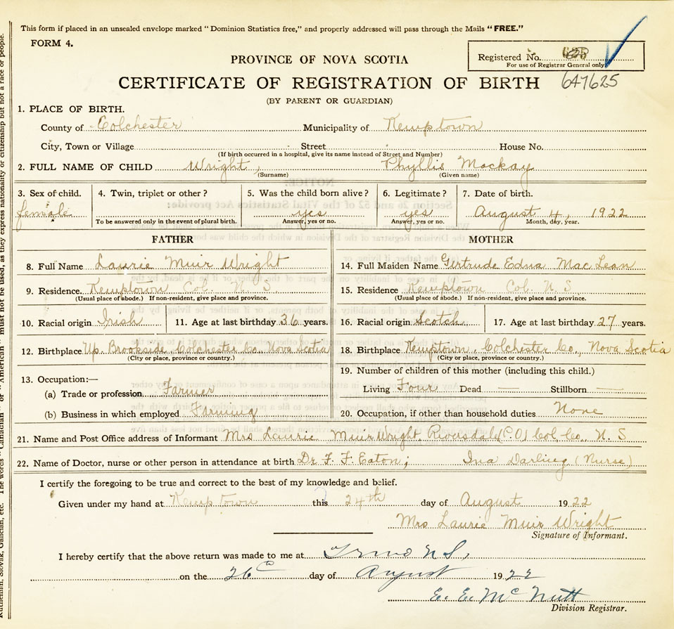 21. Name and Post Office address of Informant Mrs. Laurie Muir Wright Riversdale, Colchester County