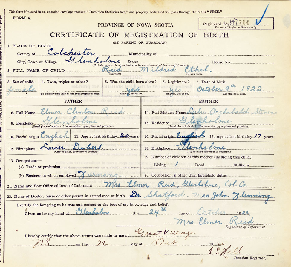 21. Name and Post Office address of Informant Mrs. Elmer Reid Glenholme, Colchester County