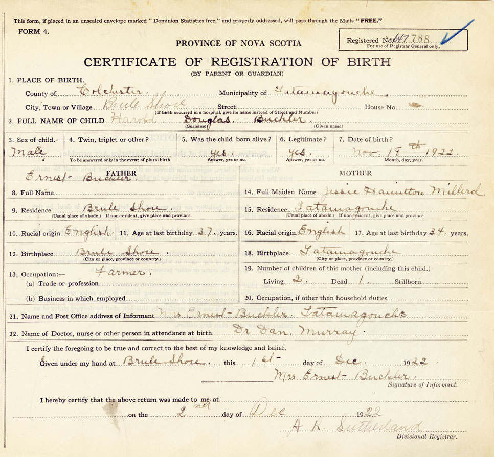 21. Name and Post Office address of Informant Mrs. Ernest Buckler Tatamagouche