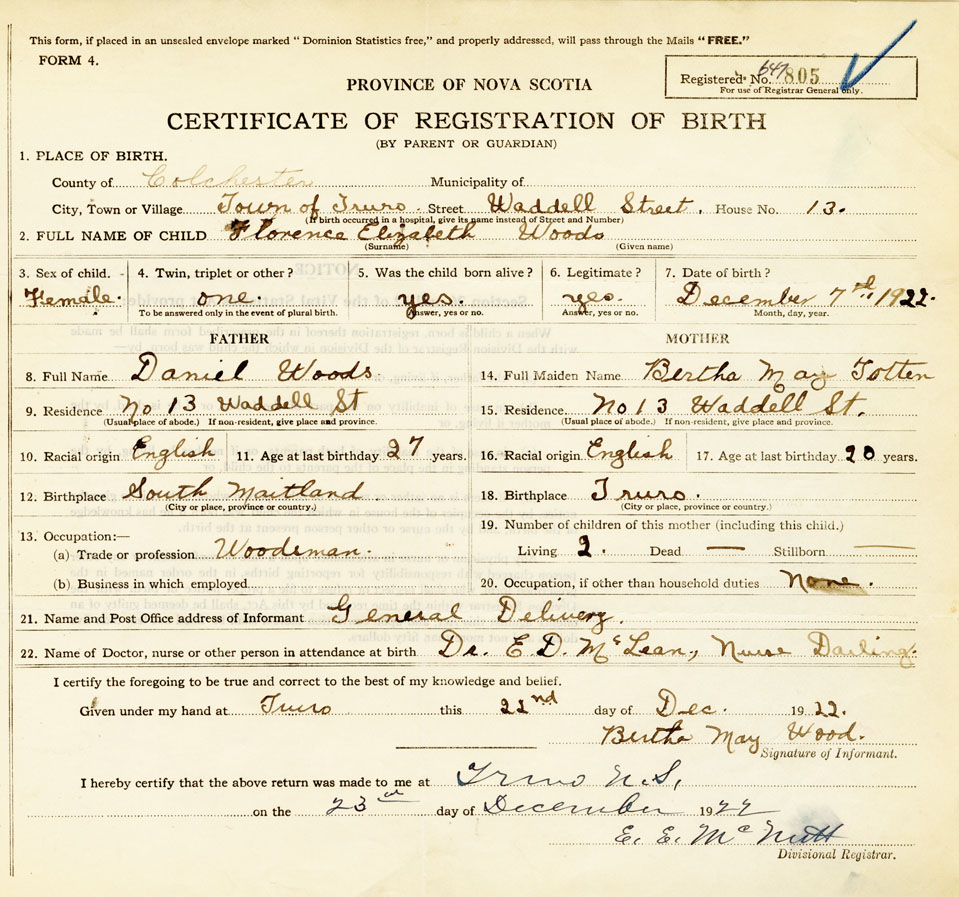 22. Name of Doctor, nurse or other person in attendance at birth Dr. E.D. McLean, Nurse Darling
