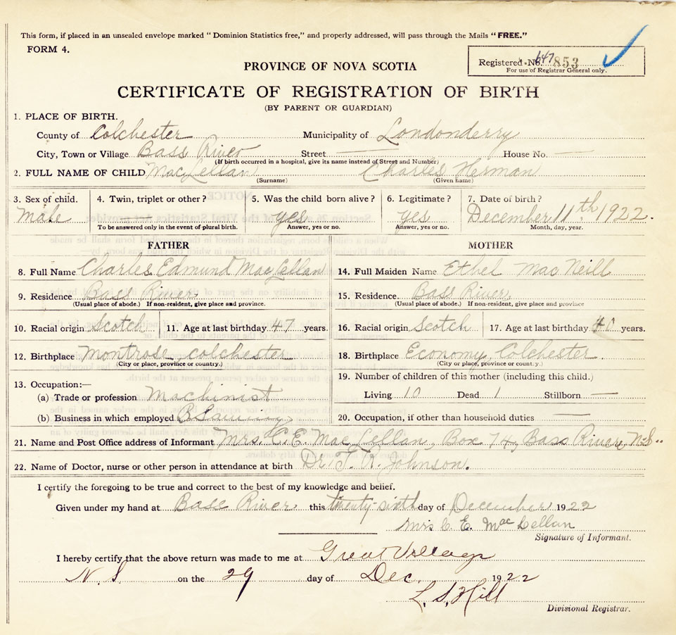 21. Name and Post Office address of Informant Mrs. C. E. MacLellan Box 74, Bass River