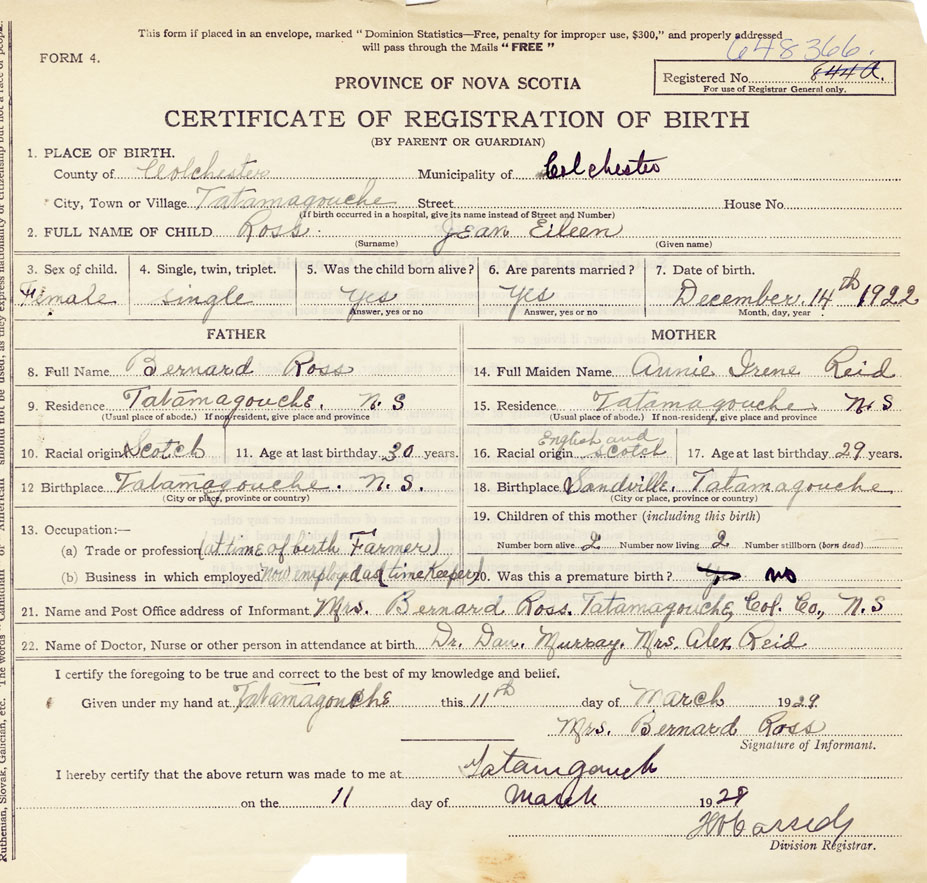 21. Name and Post Office address of Informant Mrs. Bernard Ross Tatamagouche, Colchester County