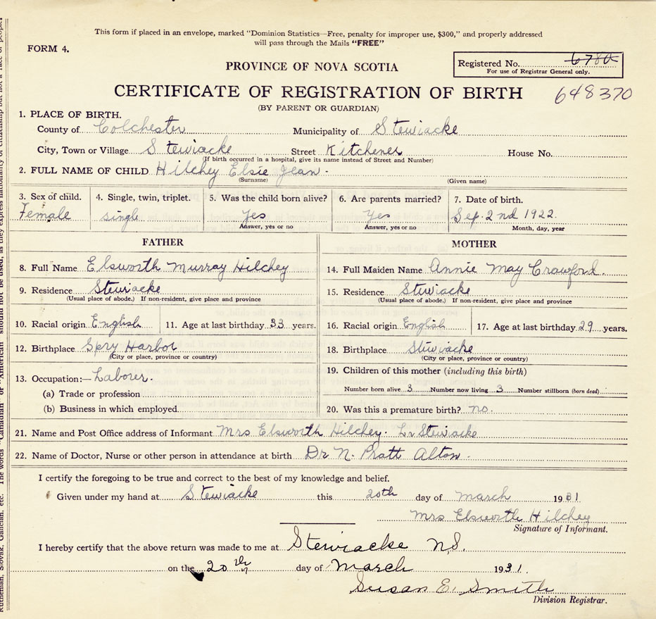 21. Name and Post Office address of Informant Mrs Elsworth Hilchey Lr Stewiacke
