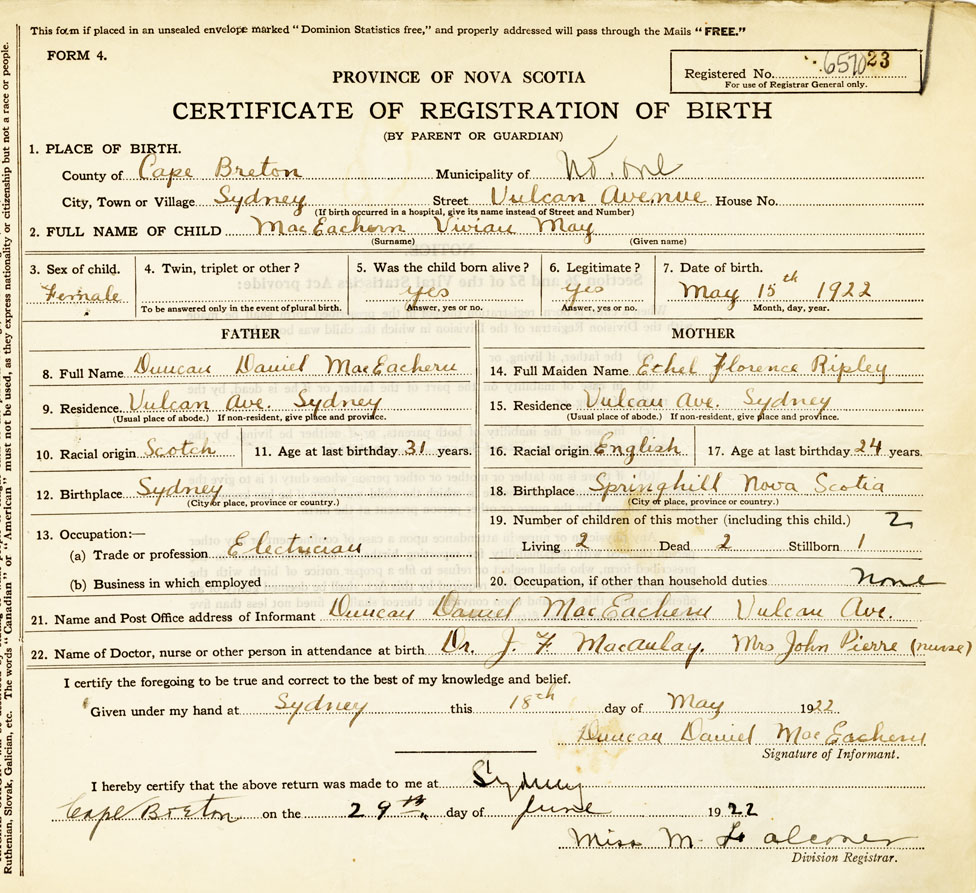 22. Name of Doctor, nurse or other person in attendance at birth Dr.J.F. MacAuley Mrs John Pierre nurse