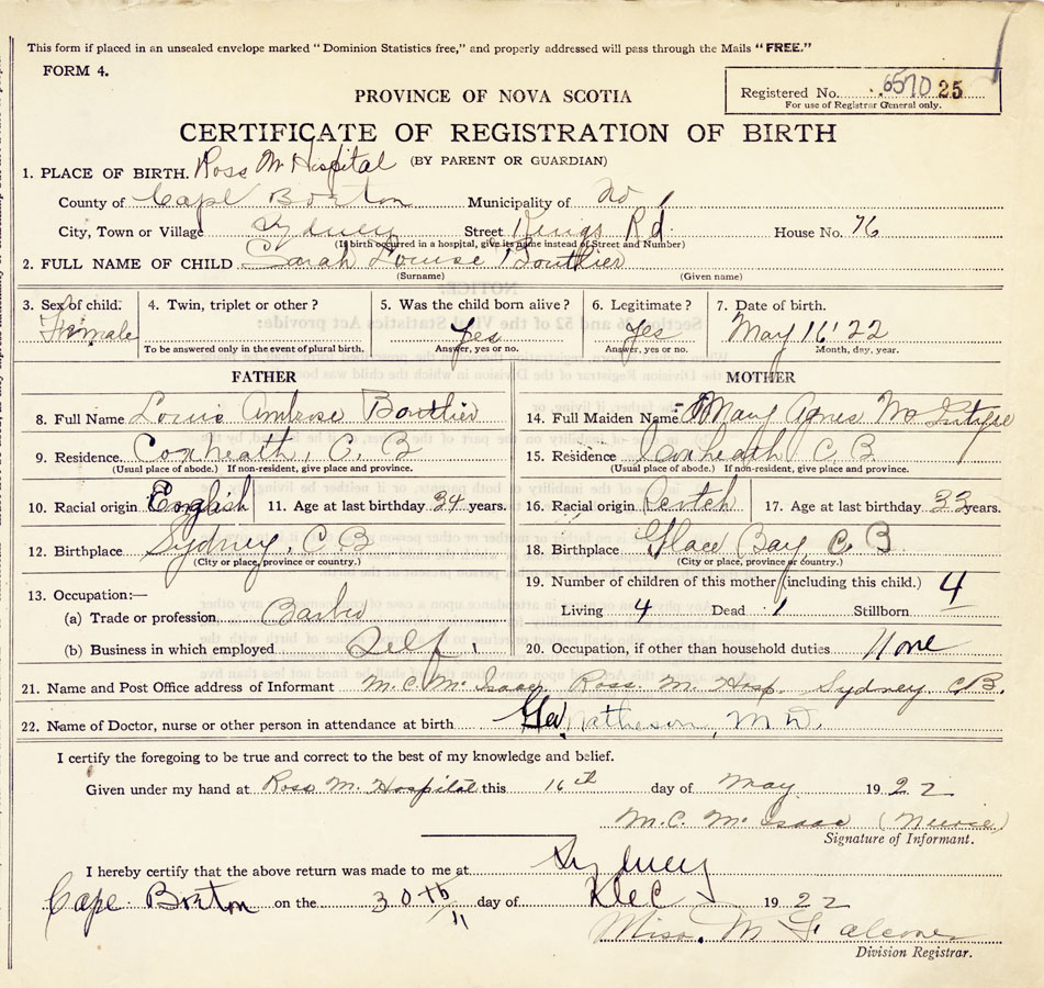 21. Name and Post Office address of Informant M.C. McIsaac Ross M. Hospital, Sydney, C.B.