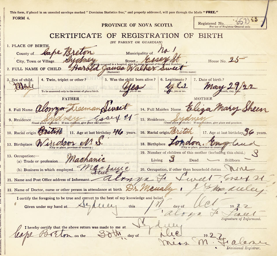 2. FULL NAME OF CHILD Sweet, Harold James Walker