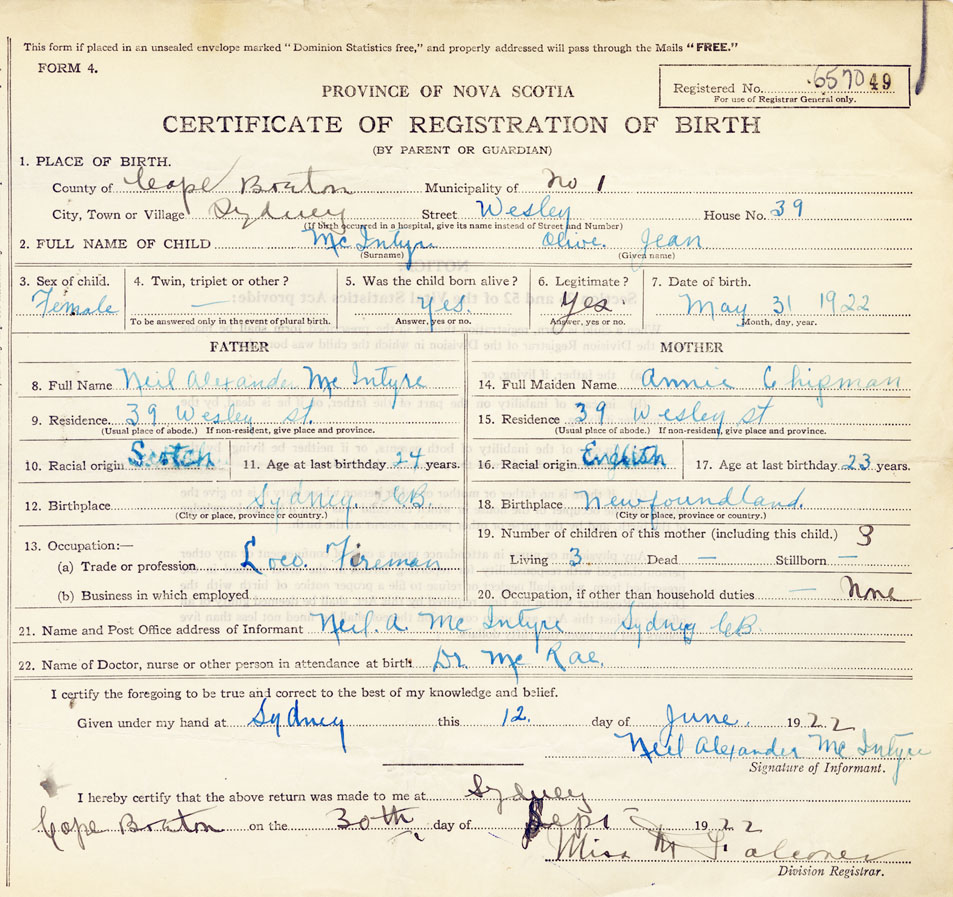 2. FULL NAME OF CHILD McIntyre, Olive Jean