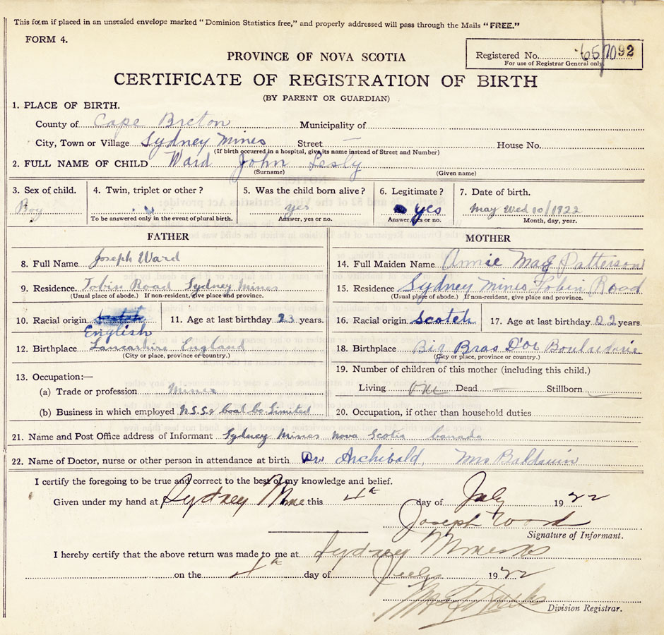 21. Name and Post Office address of Informant Joseph Ward Sydney Mines