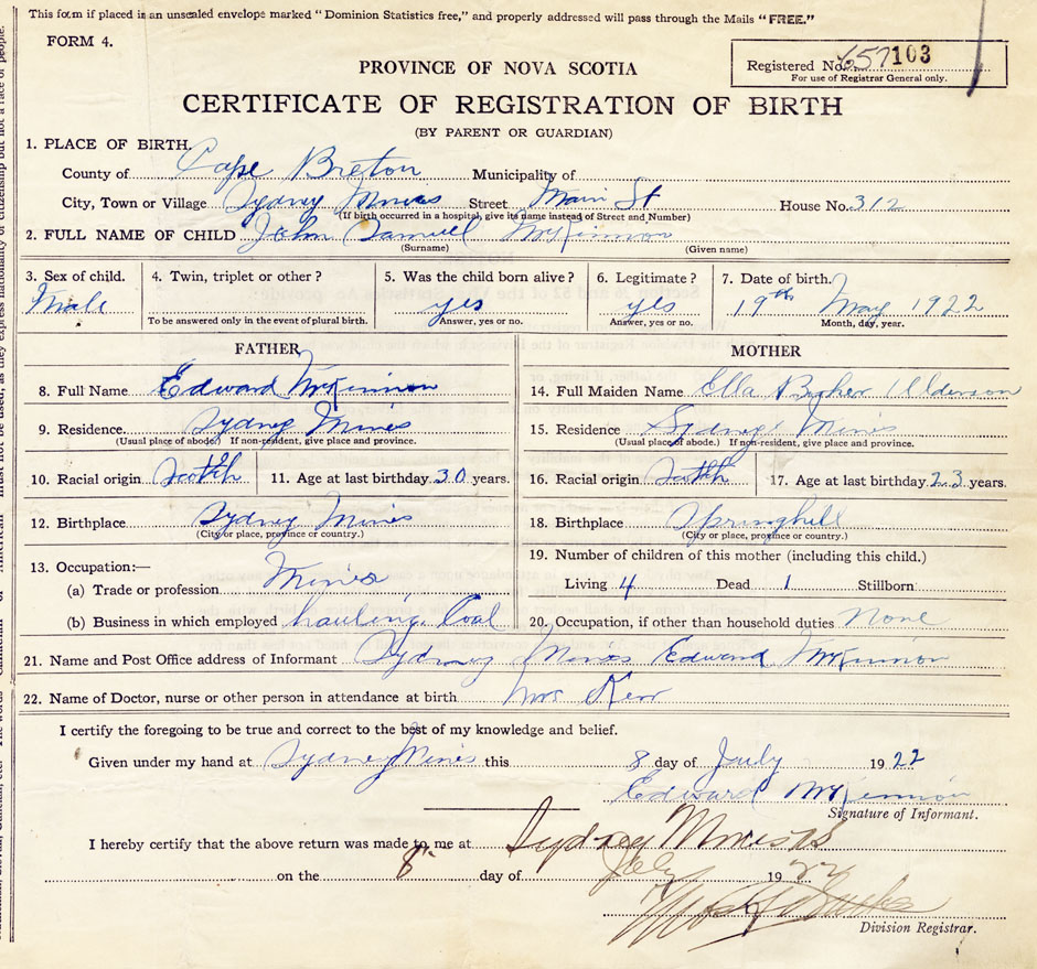 21. Name and Post Office address of Informant Edward McKinnon Sydney Mines