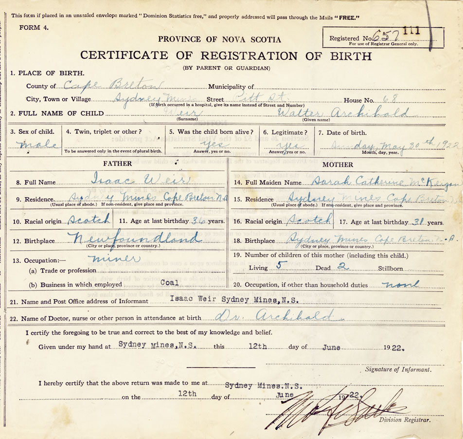 21. Name and Post Office address of Informant Isaac Weir Sydney Mines