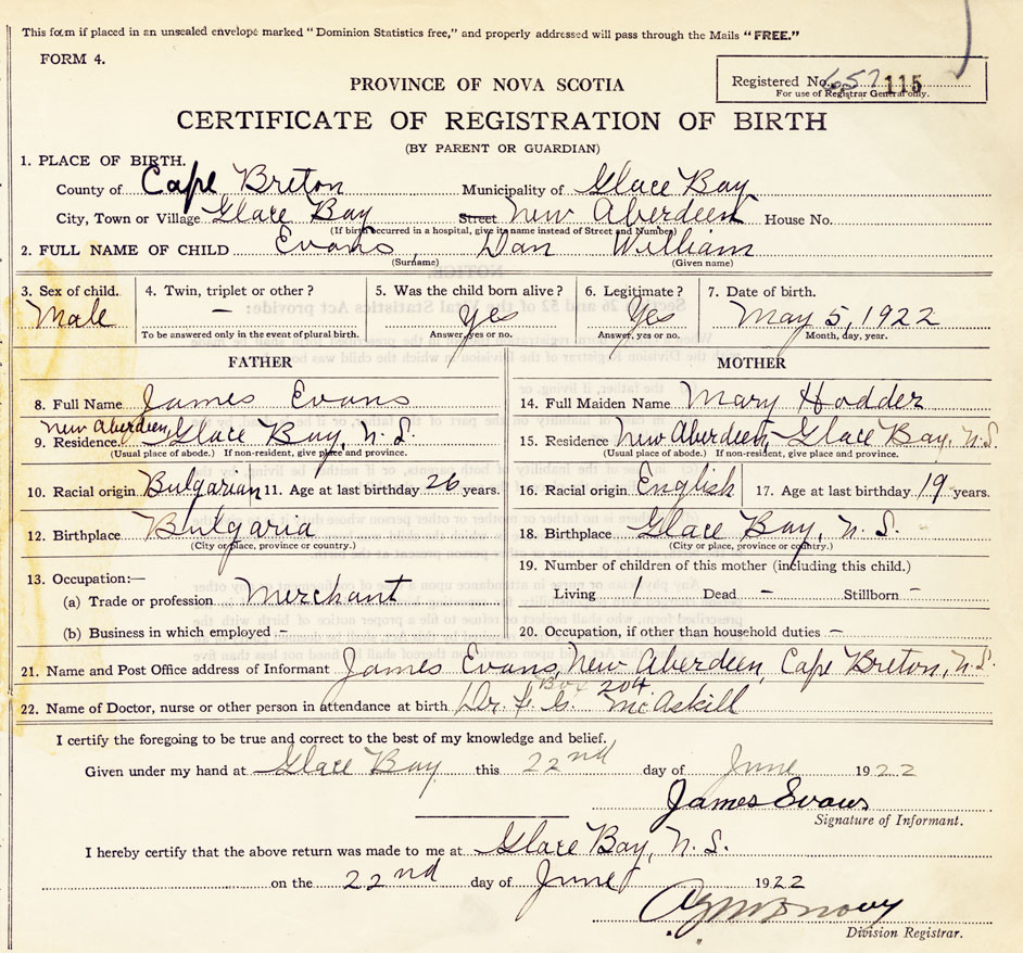21. Name and Post Office address of Informant James Evans New Aberdeen, Cape Breton