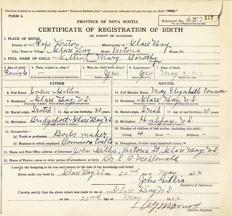 21. Name and Post Office address of Informant John Gillis Victoria St., Glace Bay