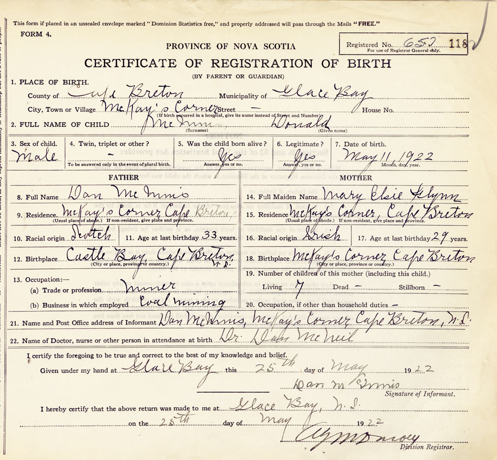 21. Name and Post Office address of Informant Dan McInnis McKays Corner, Cape Breton