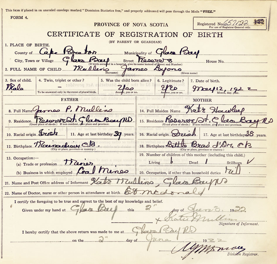 21. Name and Post Office address of Informant Kate Mullins Glace Bay