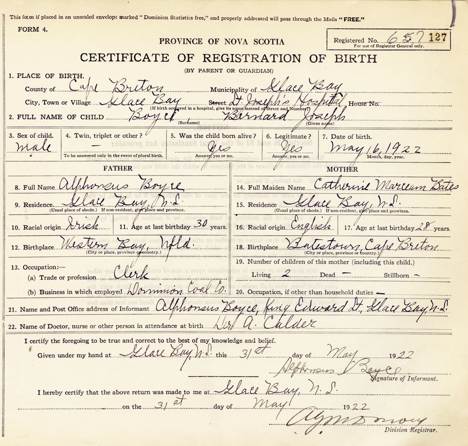 21. Name and Post Office address of Informant Alphonsus Boyce King Edward St., Glace Bay