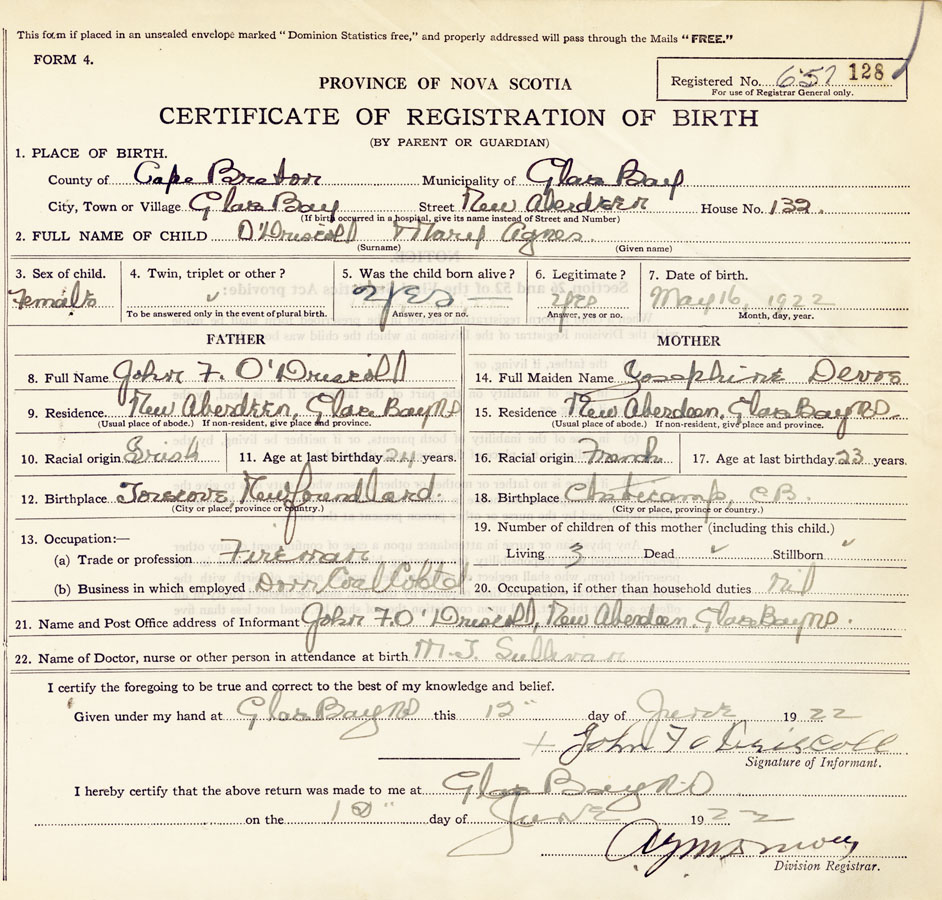 21. Name and Post Office address of Informant John F O'Driscoll New Aberdeen, Cape Breton
