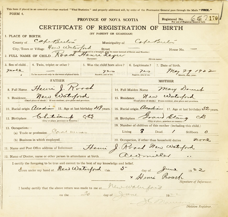 21. Name and Post Office address of Informant Henri J. Roach New Waterford