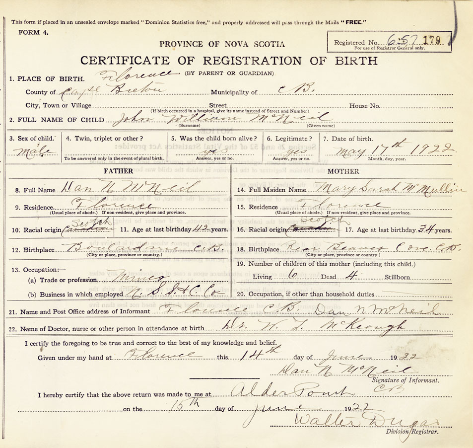 22. Name of Doctor, nurse or other person in attendance at birth Dr. W.J. McKeough