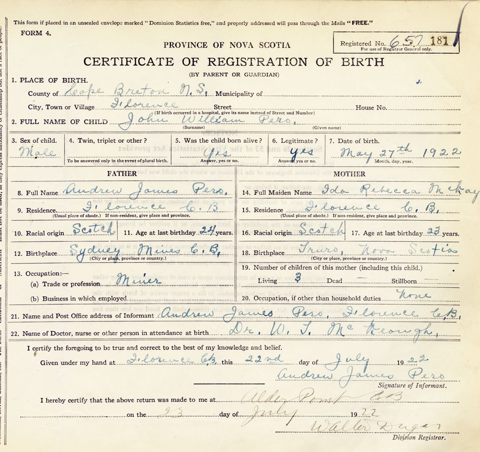 22. Name of Doctor, nurse or other person in attendance at birth Dr. WT McKeough