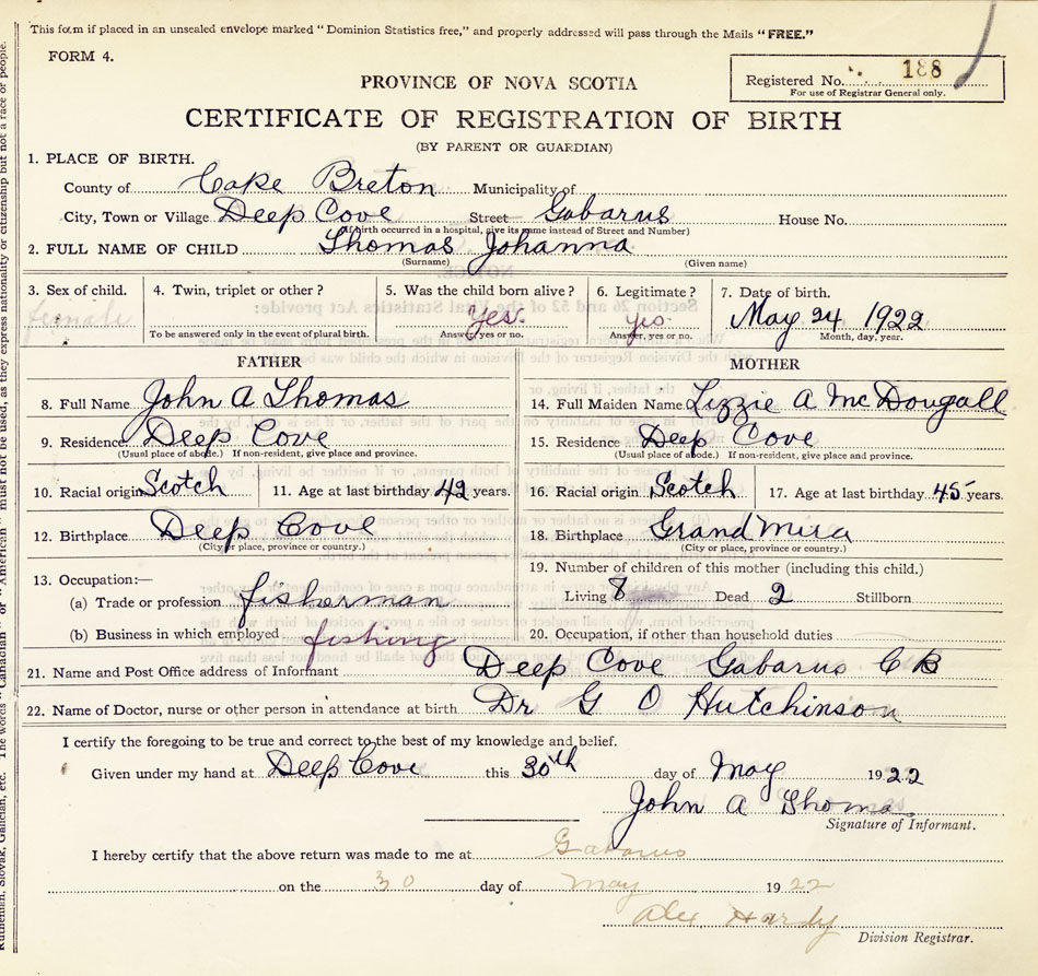 21. Name and Post Office address of Informant John A Thomas Deep Cove, Gabarus, Cape Breton