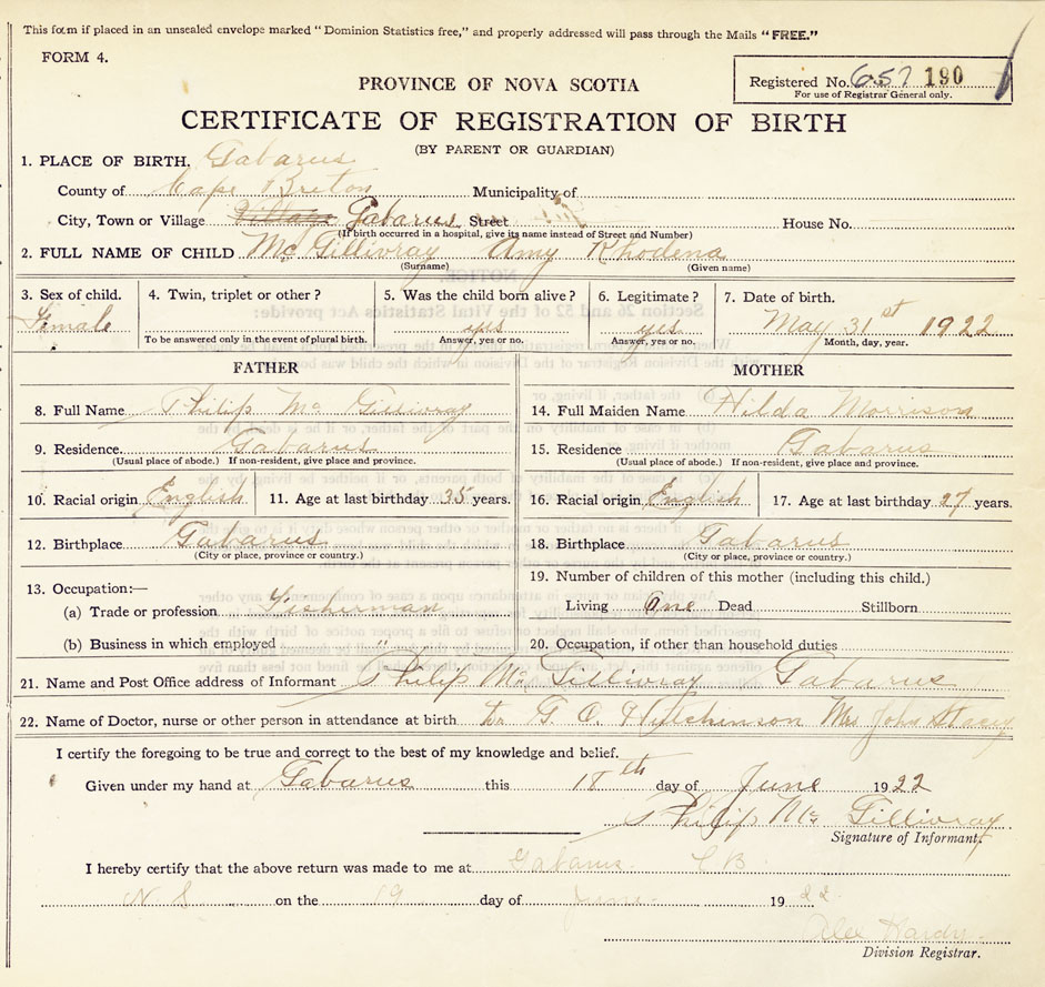 21. Name and Post Office address of Informant Philip McGillivray Gabarus