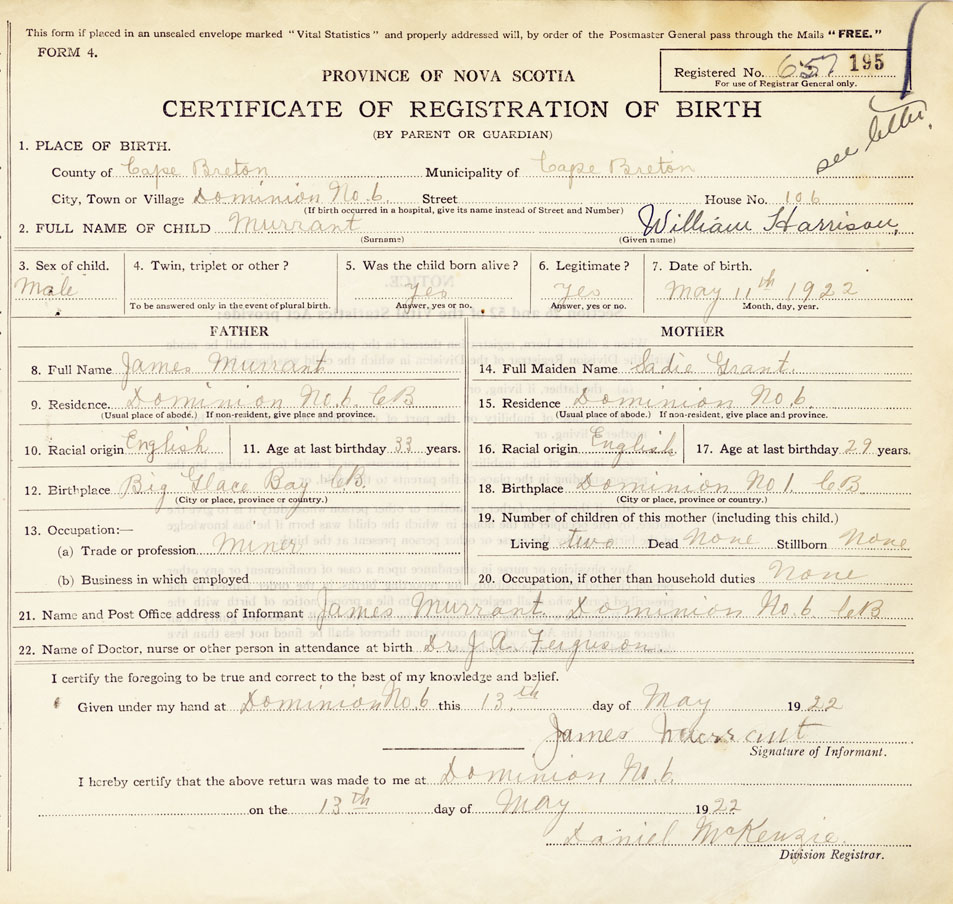 21. Name and Post Office address of Informant James Murrant Dominion No. 6, Cape Breton